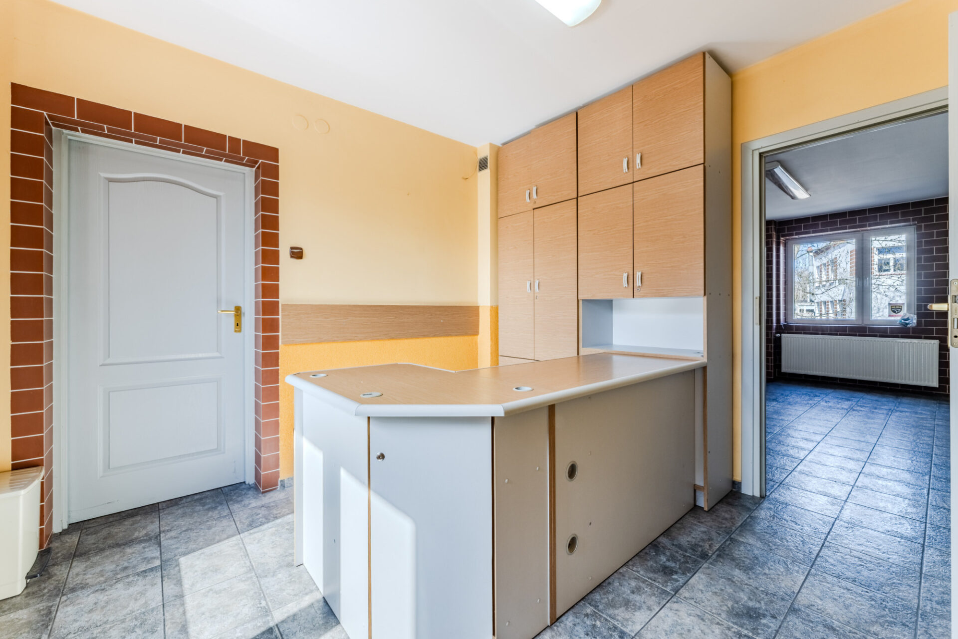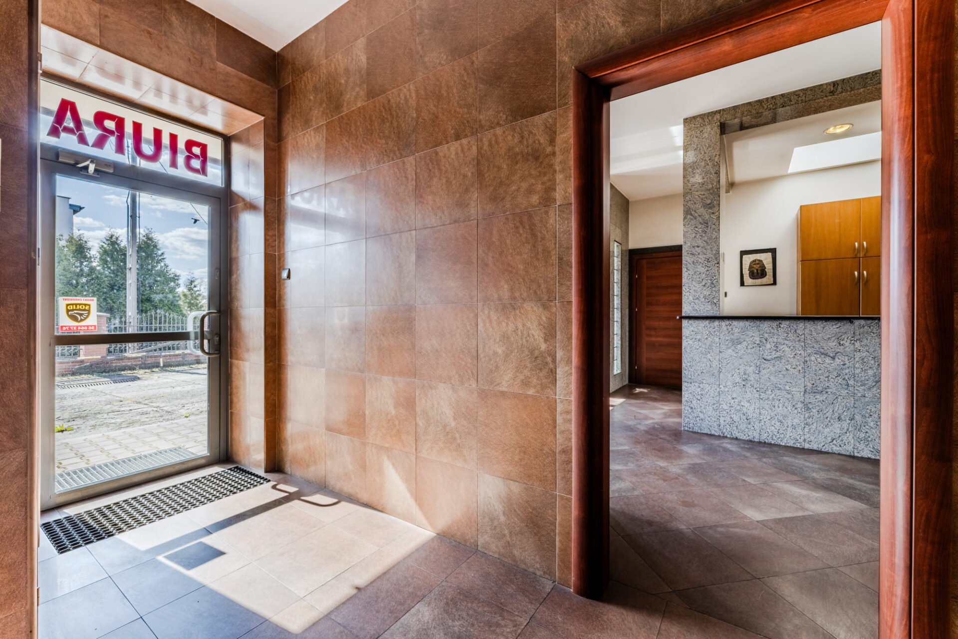 W skład pomieszczeń na parterze wchodzą: sala konferencyjna, recepcja, cztery pomieszczenia biurowe, trzy toalety oraz hol. Na piętrze znajduje się jadalnia, dwa pomieszczenia biurowe, łazienka z prysznicem i toaletą oraz szatnia. Do budynku przylega parterowa hala warsztatowa składająca się dwóch pomieszczeń, w tym jednego z wjazdem przez bramę garażową oraz kotłowni. Doświetlenie od strony południowej, zachodniej oraz północnej. Nieruchomość wyposażona jest w system alarmowy.