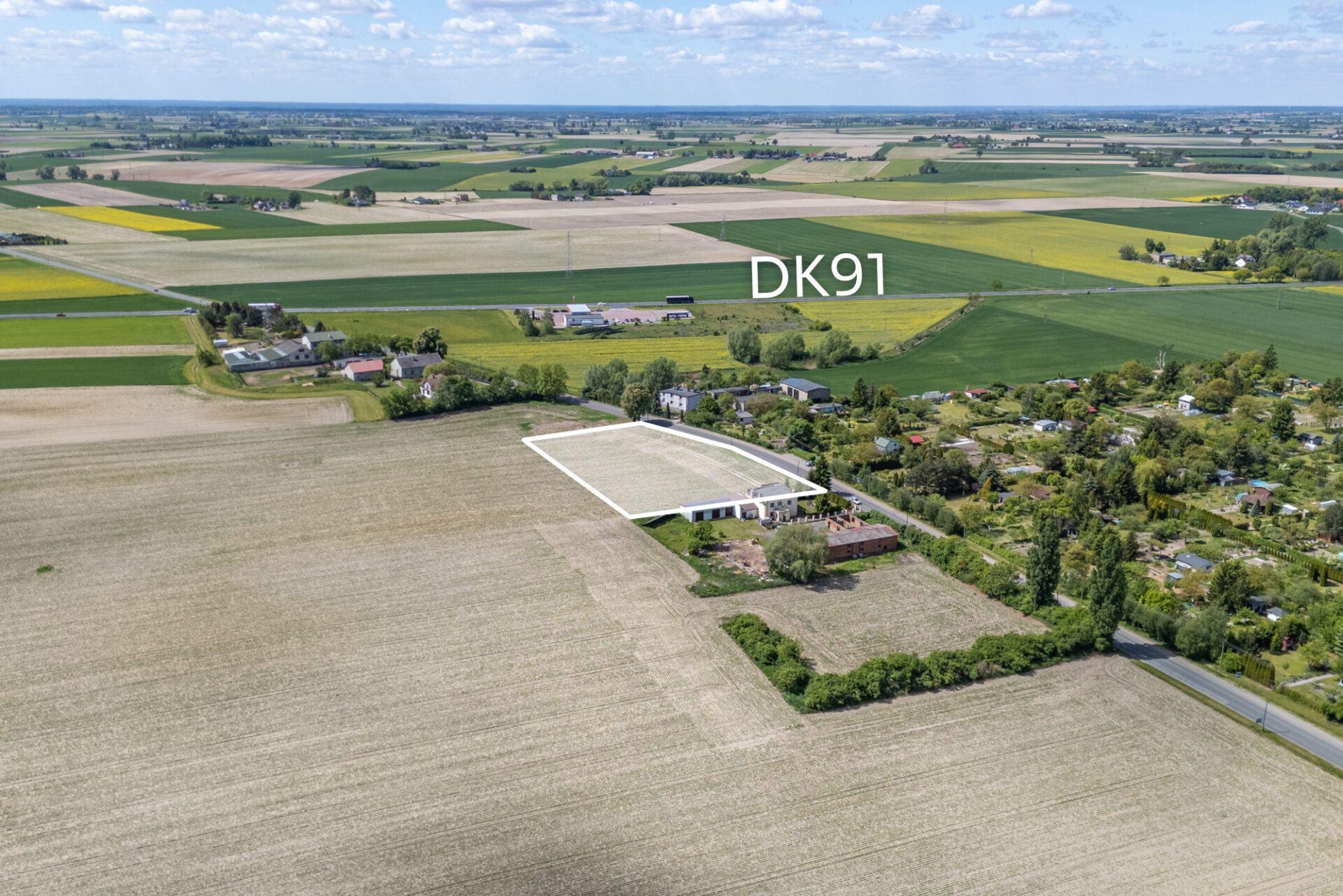 Działka budowlana o powierzchni 4774 m2 w kształcie zbliżonym do prostokąta, teren płaski, niezalesiona. Dojazd do działki drogą asfaltową. Linia telekomunikacyjna znajduje się na słupach przy granicy działki, sieć kanalizacyjna przebiega w drodze wzdłuż tej granicy, sieć wodociągowa zlokalizowana jest po przeciwnej stronie ulicy, natomiast napowietrzna linia elektroenergetyczna przebiega również po przeciwnej stronie drogi, na słupach energetycznych. Dla działki wydano decyzję o warunkach zabudowy, ustalającą przeznaczenie terenu pod zabudowę usługową. Dopuszcza się na niej usługi z zakresu usług nieuciążliwych w tym handlu do 2000 m2 powierzchni sprzedaży. Wysokość zabudowy powinna wynosić nie więcej niż 6 metrów, zarówno dla budynku usługowego jak i magazynowego. Udział powierzchni zabudowy: