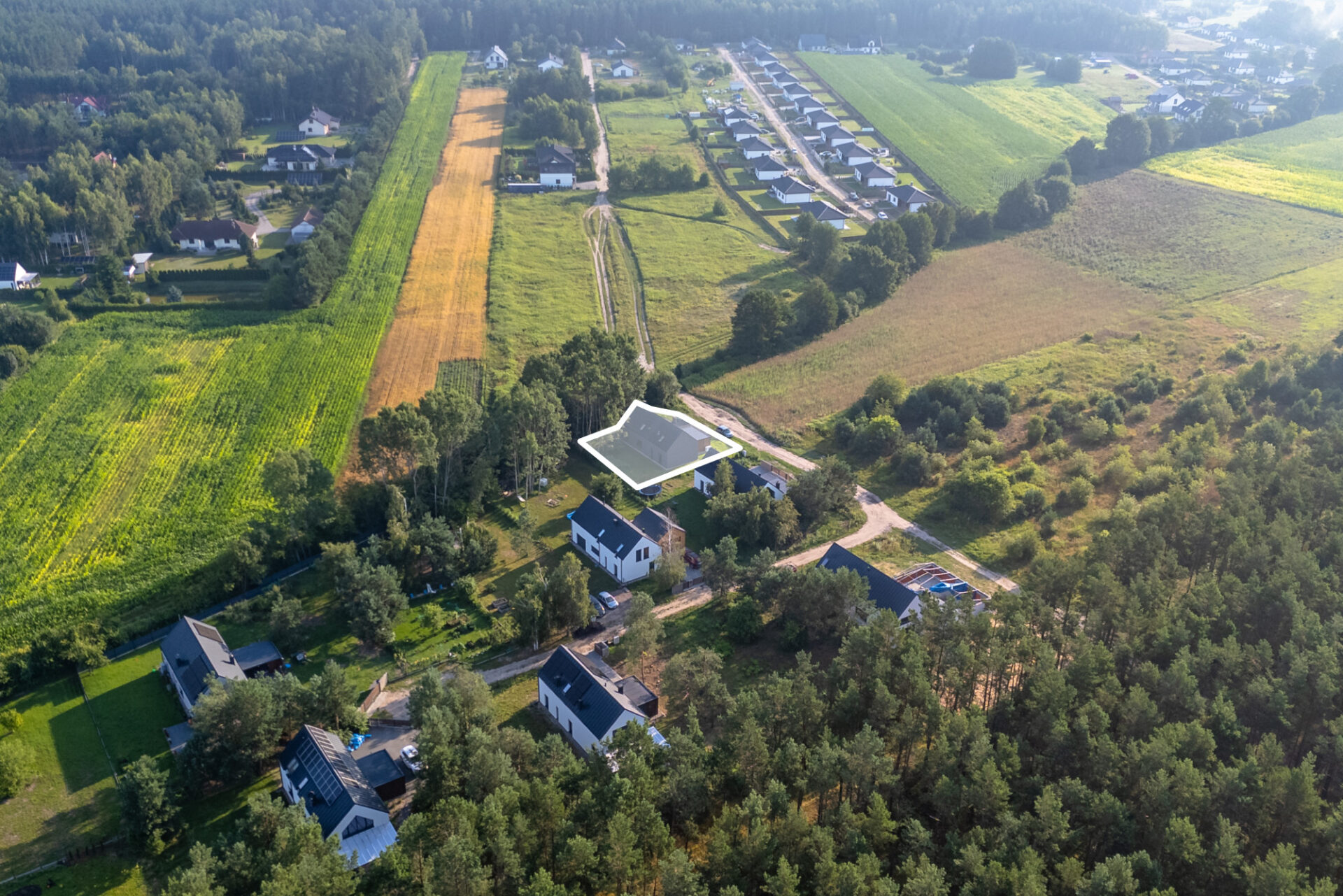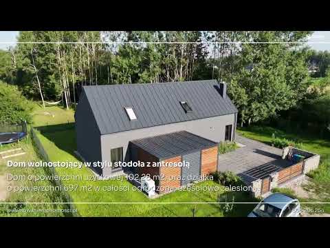 Dom wolnostojący w stylu stodoła z antresolą stanowiącą piętro, wybudowany z gazobetonu w 2024 roku. Dach pokryty panelami z blachy. Ogrzewanie poprzez powietrzno-wodną pompę ciepła firmy Stiebel Eltron. W całym budynku rozprowadzone jest ogrzewanie podłogowe. Przygotowane zostały wyprowadzenia zewnętrzne oraz wewnętrzne do systemu alarmowego, wyprowadzenie instalacji elektrycznej pod oświetlenie zielonej części tarasu, pod automatykę bramy wjazdowej oraz zasilanie solarne i zasilanie awaryjne. Zamontowane zostały również gniazda 230V do kamer. Do budynku został doprowadzony internet światłowodowy. Na terenie posesji znajduje się własna studnia głębinowa, zapewniająca niezależne źródło wody, z możliwością podłączenia do sieci wodociągowej gminnej. Dodatkowo nieruchomość wyposażona jest w przydomową oczyszczalnięścieków, funkcjonującą na bazie osadnika gnilnego o pojemności 2000 litrów. W budynku komin z możliwością instalacji kominka.