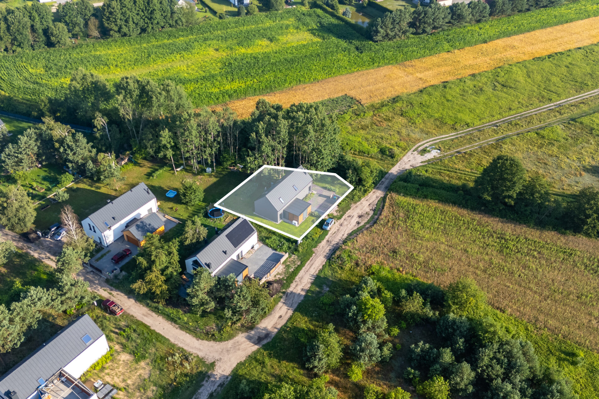Działka o powierzchni 697 m2 w całości ogrodzona, częściowo zalesiona. Do budynku przylega wiata wraz ze schowkiem, której powierzchnia wynosi 26,10 m2. Od frontu brama stalowa z drewnianym wykończeniem. Podcień i chodnik wyłożony kostką betonową. Przed domem znajduje się również eco kratka z konglomeratu przeznaczona do własnej aranżacji. Teren płaski, działka w kształcie zbliżonym do prostokąta.
