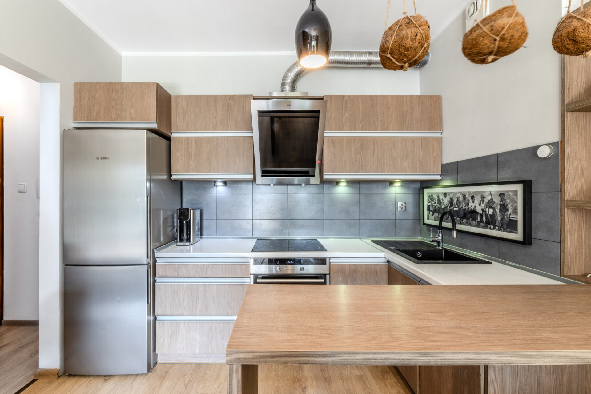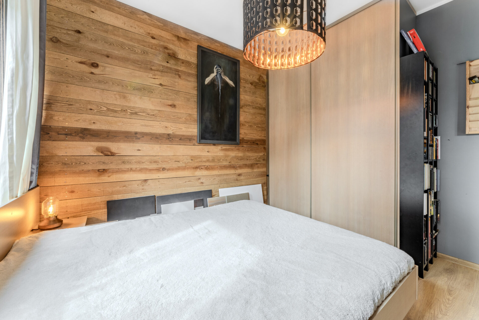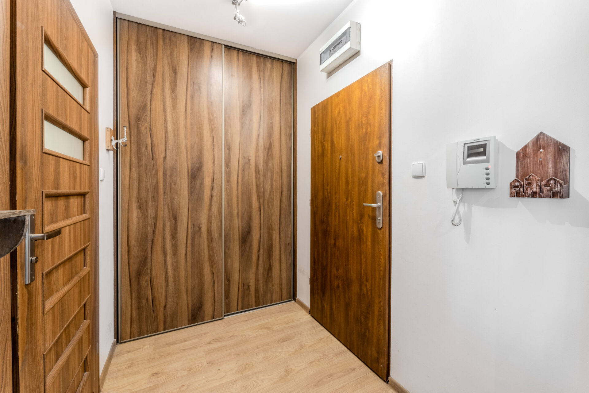 Standard wykończenia: ściany – gładź gipsowa, drewniane panele ścienne, kamień dekoracyjny, podłogi – panele, łazienka – gres. Mieszkanie jest ciche i ciepłe – ponadstandardowa grubość ścian działowych – 15 cm.