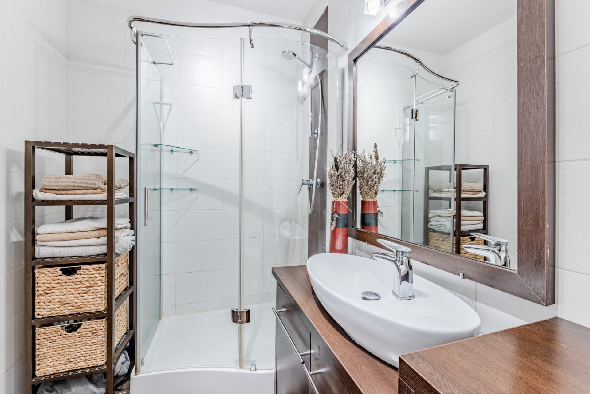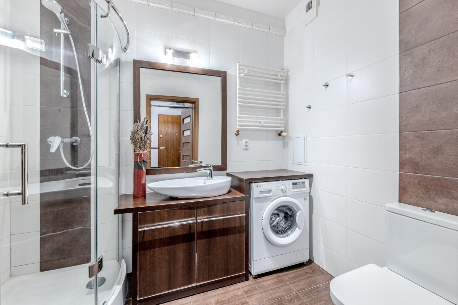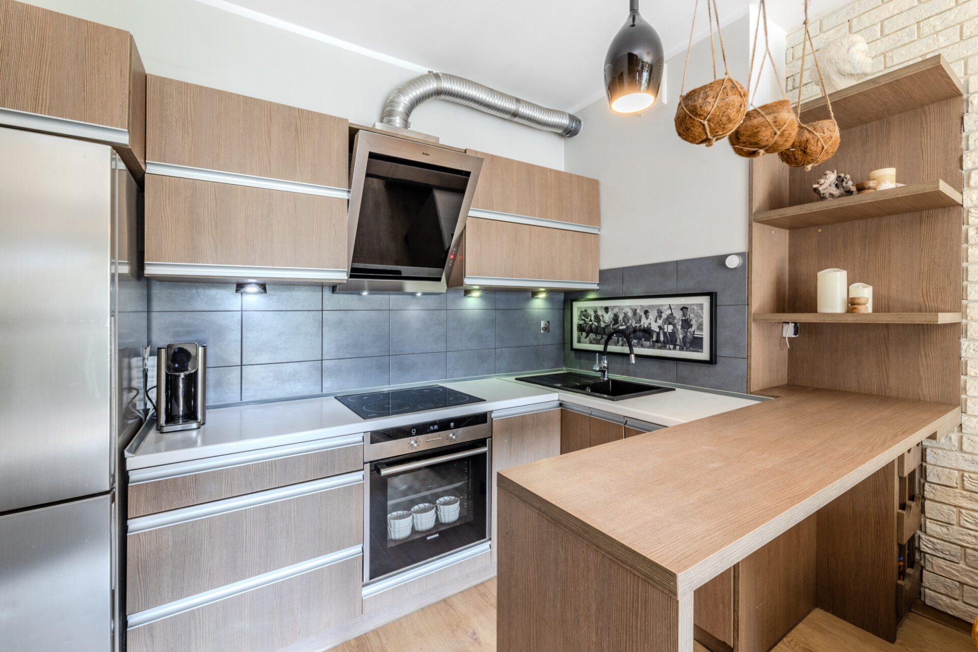 Standard wykończenia: ściany – gładź gipsowa, drewniane panele ścienne, kamień dekoracyjny, podłogi – panele, łazienka – gres. Mieszkanie jest ciche i ciepłe – ponadstandardowa grubość ścian działowych – 15 cm.
