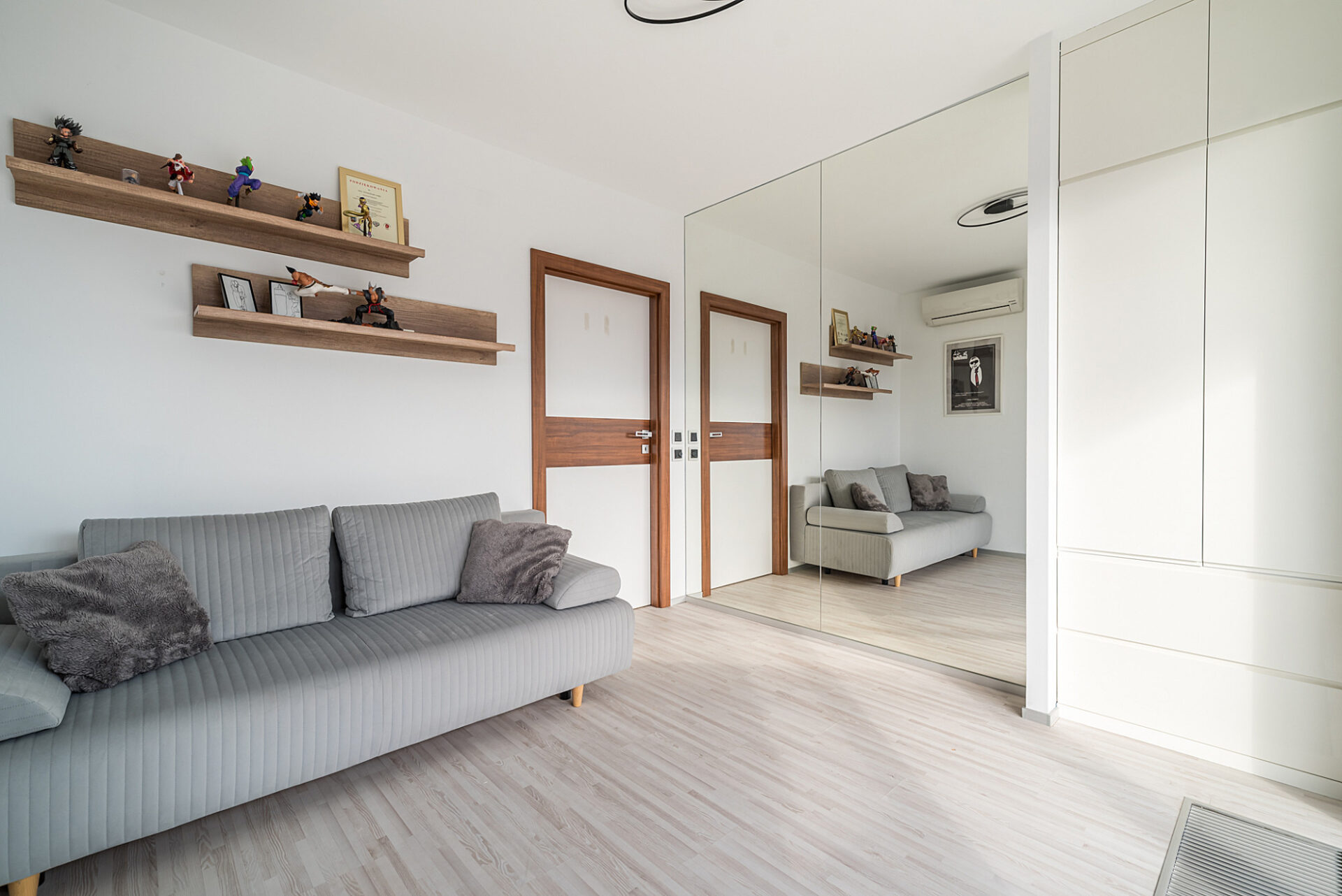 Standard wykończenia: ściany – gładź gipsowa, podłogi – deska, panele, gres; łazienka – gres, zabudowa na wymiar. Mieszkanie bardzo jasne i słoneczne. Wystawa okien na stronę zachodnią, wschodnią i południową. Wyposażenie mieszkania: kuchnia w zabudowie na wymiar, piekarnik, zmywarka, kuchenka, lodówka, zabudowa na wymiar w obu sypialniach, klimatyzacja, wideodomofon, rolety antywłamaniowe. W łazienkach duża wanna wolnostojąca i prysznic.